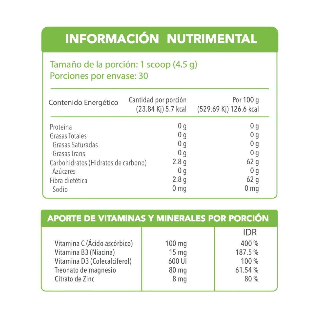 Inulina de agave orgánica, Pulpa de limón en polvo, Ácido cítrico, Vitamina C (Ácido ascórbico), Extracto de estevia, Sabor natural limón, Treonato de magnesio, Vitamina B3 (Niacina), Tetrahidrocurcumina estandarizada al 95% (Curcuma Longa), Citrato de zinc, Vitamina D3 (Colecalciferol).