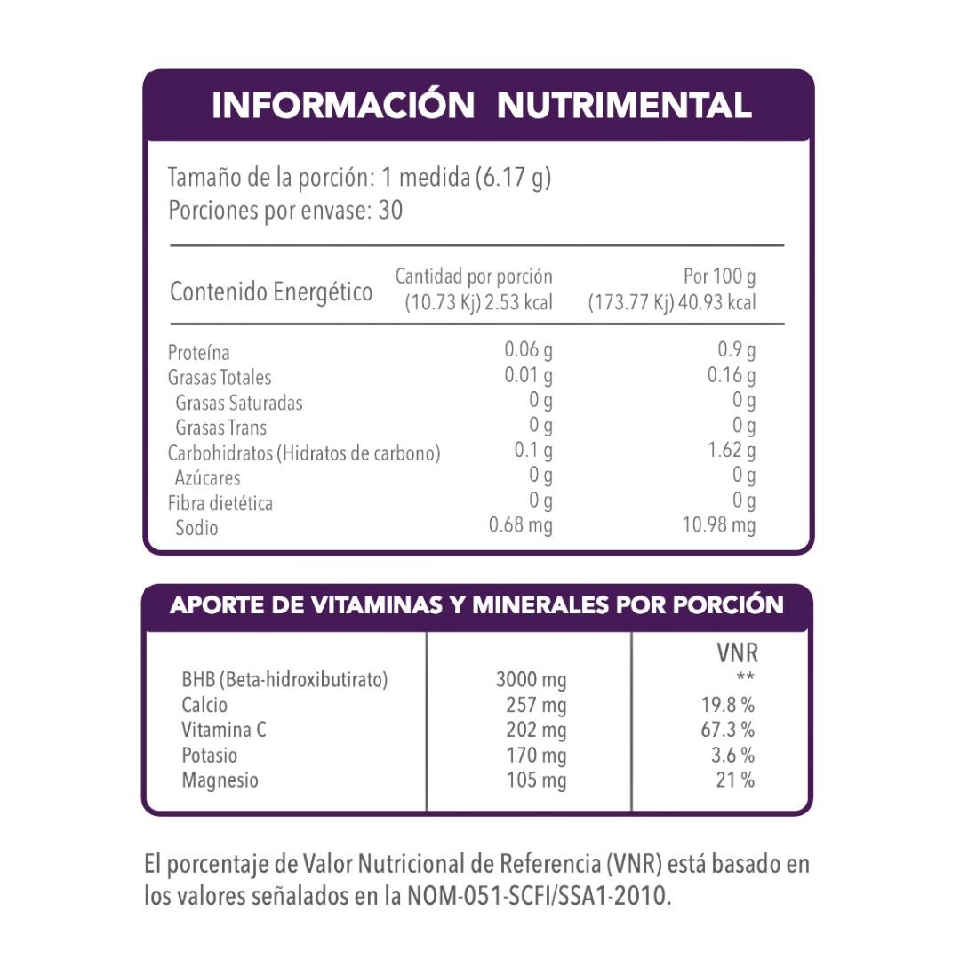 Beta-hidroxibutirato de calcio, Beta-hidroxibutirato de magnesio, Beta-hidroxibutirato de sodio, Beta-hidroxibutirato de potasio, Ácido Citrico, Citrato de potasio, Pulpa de arándano, Sabor natural arándano, Vitamina C, Carbonato de calcio, Sabor natural acai, Glicinato de magnesio, Pulpa de betabel, Treonato de magnesio, Dióxico de silicio, Extracto de estevia (0.15 g/100 g).
